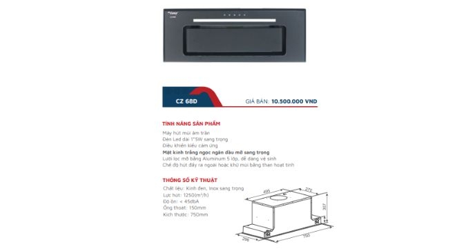 Máy hút mùi Canzy CZ 68D là dòng máy hút mùi âm trần hiện đại, thiết kế tinh tế với mặt kính đen và inox sang trọng, giúp không gian bếp luôn sạch sẽ và thoáng mát. Với lực hút mạnh mẽ cùng công nghệ lọc mùi tiên tiến, sản phẩm mang lại sự tiện nghi tối đa cho gia đình.