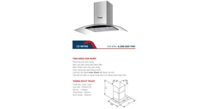Máy hút mùi Canzy CZ 9970S là dòng sản phẩm máy hút mùi kính cong hiện đại, được thiết kế sang trọng với chất liệu Inox kết hợp kính cường lực cao cấp. Với lực hút mạnh mẽ lên đến 1100 m³/h, CZ 9970S giúp không gian bếp luôn sạch thoáng, loại bỏ mùi khó chịu nhanh chóng và vận hành êm ái.